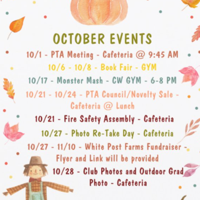 All PTA meetings will be in the school cafeteria on Wednesdays unless otherwise noted.